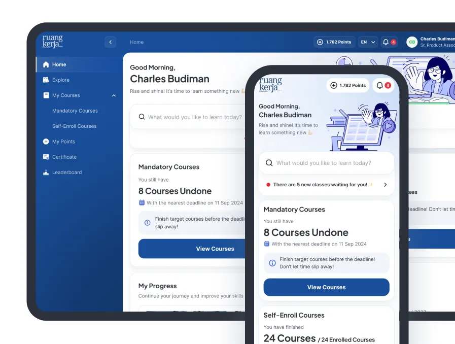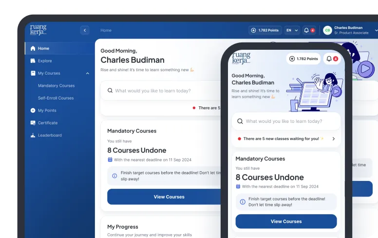 Ruangkerja sangat mendukung program training online kami. Platformnya mudah digunakan, dapat diakses kapan saja dan di mana saja, serta menyediakan video pelatihan berkualitas yang sesuai dengan kebutuhan kami.