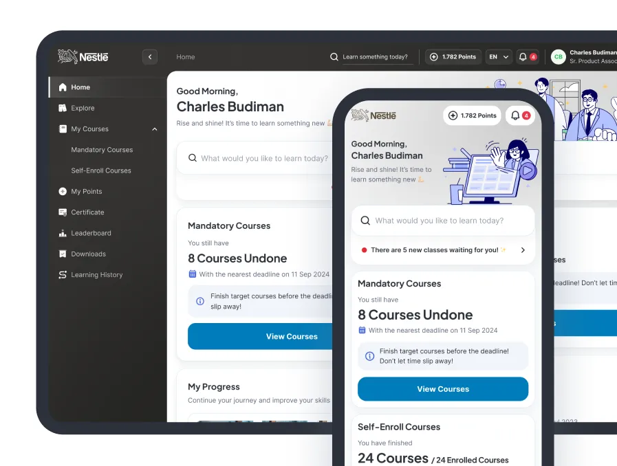 Dashboard monitoring menampilkan data secara komprehensif dan real-time, memudahkan pemantauan progres pelatihan. Fitur ini juga sangat membantu saat perlu menyiapkan laporan secara cepat.